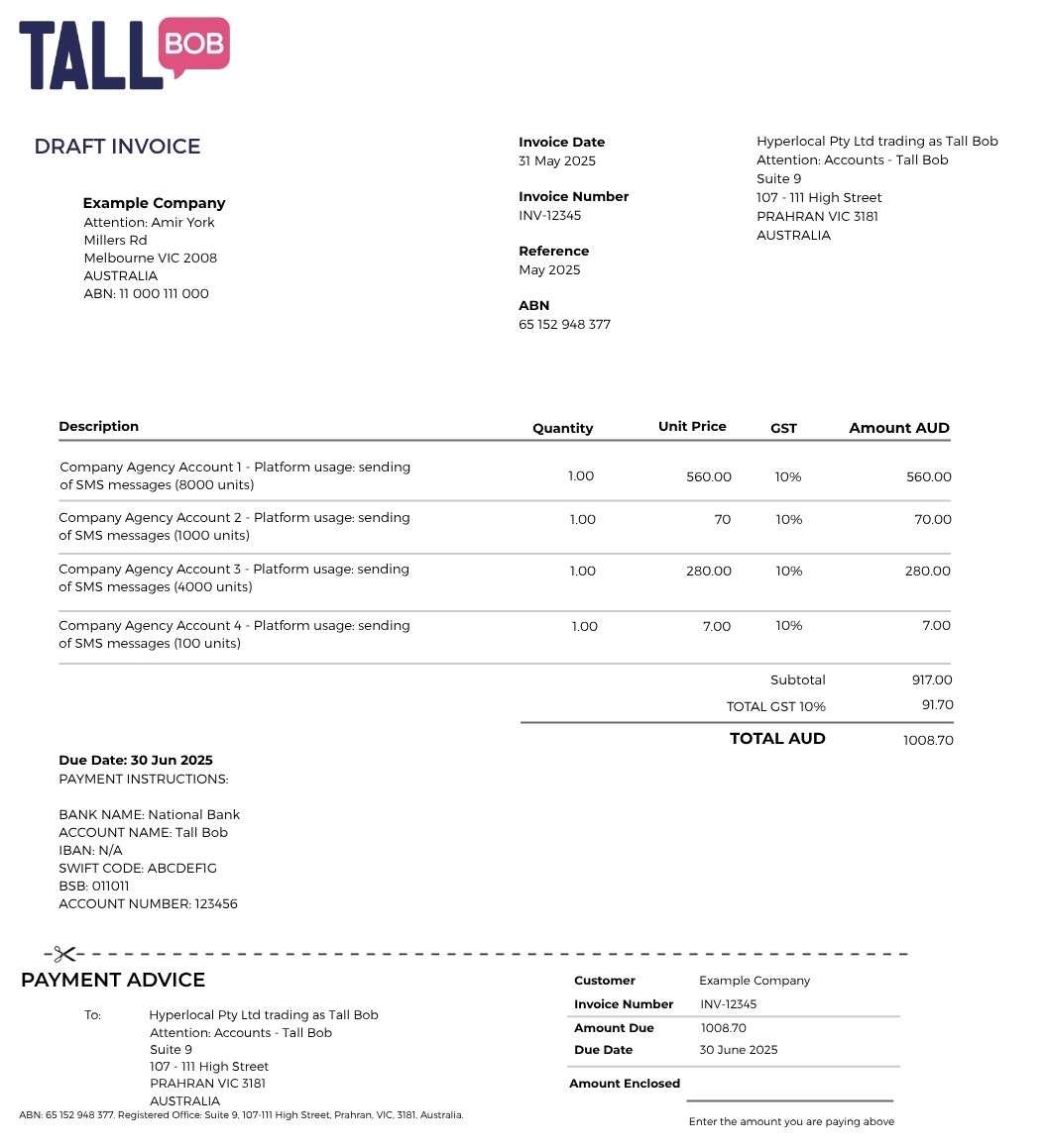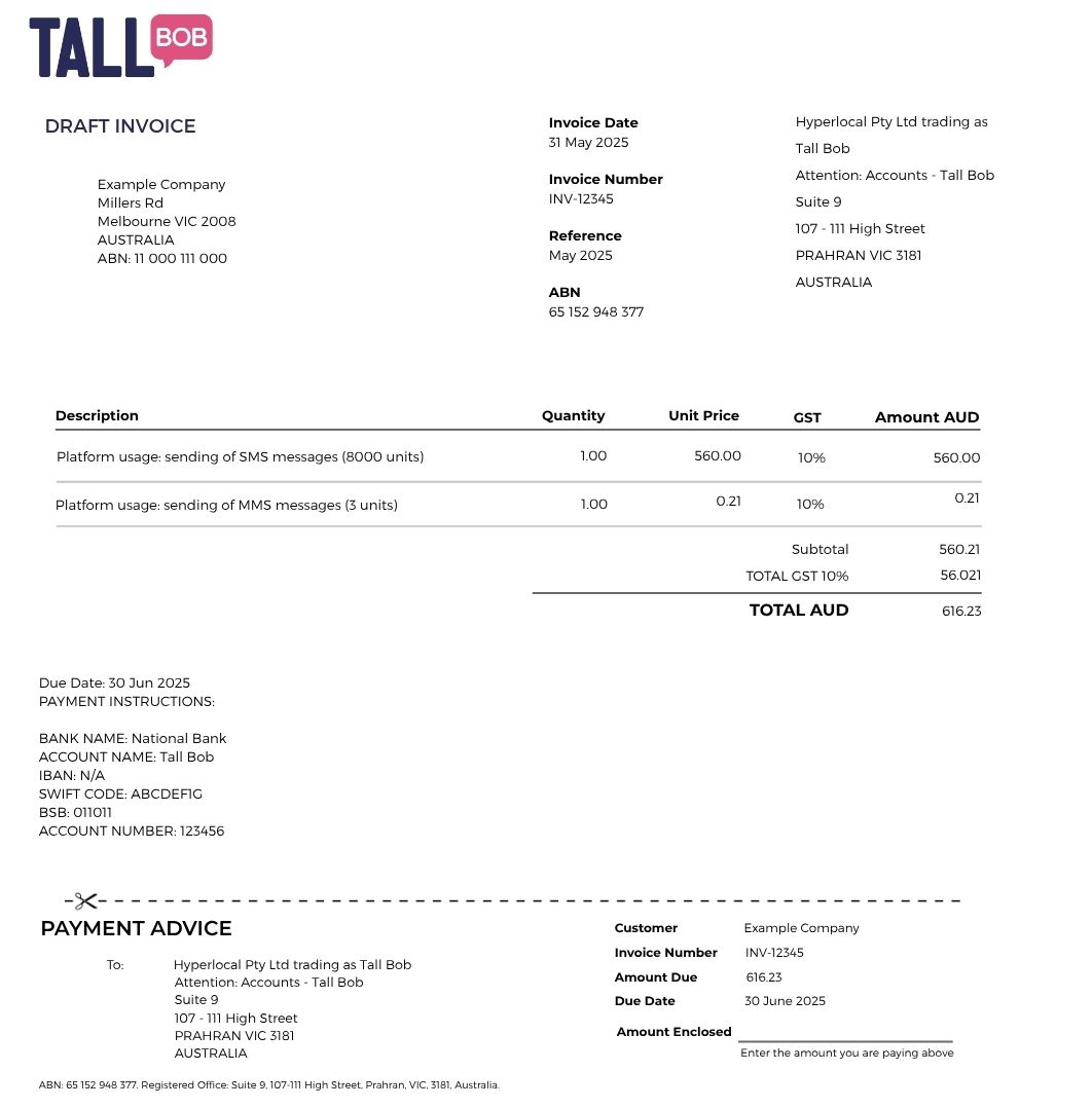- Any platform, longcode or shortcode fees will appear on a separate invoice.